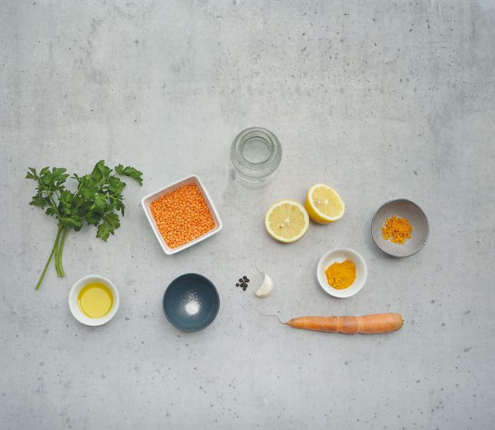 - Das Wasser dazugießen und aufkochen. Abgedeckt für 10 Minuten auf niedriger Stufe köcheln lassen. Sind die Linsen zerfallen, alles in einen hohen Rührbecher umfüllen und kurz abkühlen lassen.