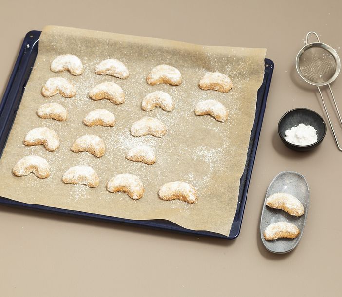 4. Vom Teig ca. 1–2 cm dicke Scheiben abschneiden, zu Röllchen formen und diese halbmondförmig biegen. Auf das Backblech legen und im Ofen 10–15 Minuten backen.